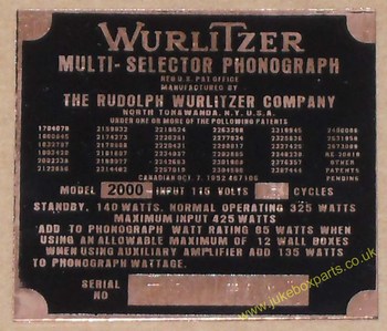 Wurlitzer 2000 Copper Identification Plate (JP600)